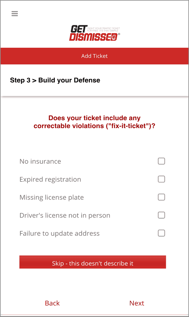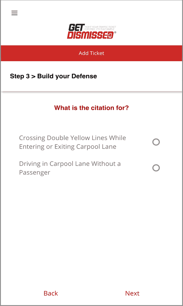 We know you want GetDismissed to work so please follow the next important part carefully. What will happen next is that you will tap through a short series of menus that describe your particular type of ticket (See Figures 6 and 7). For example, if you received a speeding ticket the app will ask you; “How did the officer measure your speed?” And then a series of possible options will let you select the correct choice.