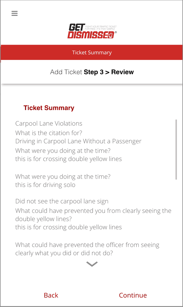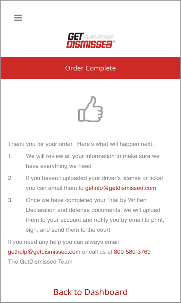 Remember just because you’re fighting your ticket using the Trial by Declaration method it doesn’t mean you’ve given up your right to confront the officer and see a judge face-to-face. Even if you lose the Trial by Declaration you can still go into court and have a whole new trial with a judge. You’ve lost almost nothing by using the GetDismissed App!