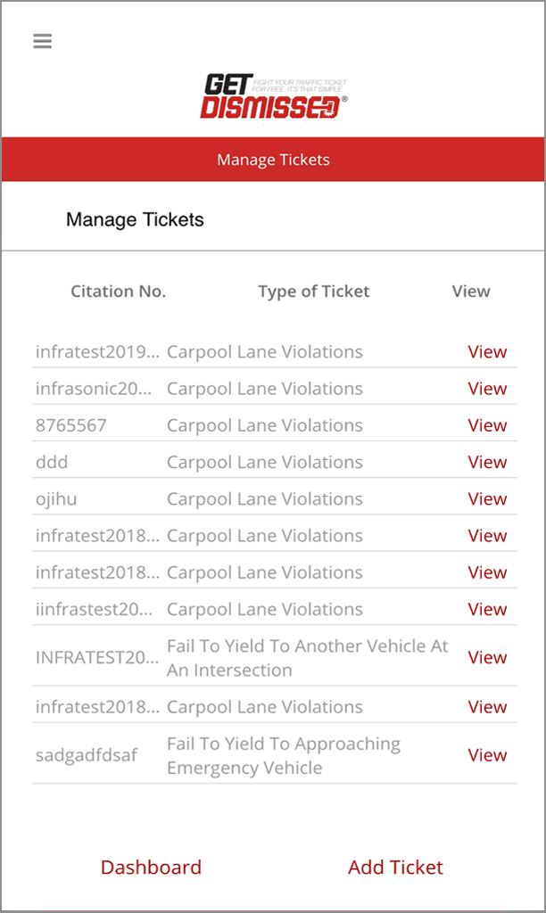 Like many drivers, you may receive several tickets over time. The Ticket History section is where you will go to manage all your tickets that you process through GetDismissed. You will see a list of all your tickets and you can just select view next to the ticket you would like to manage (See Figures 17 & 18).